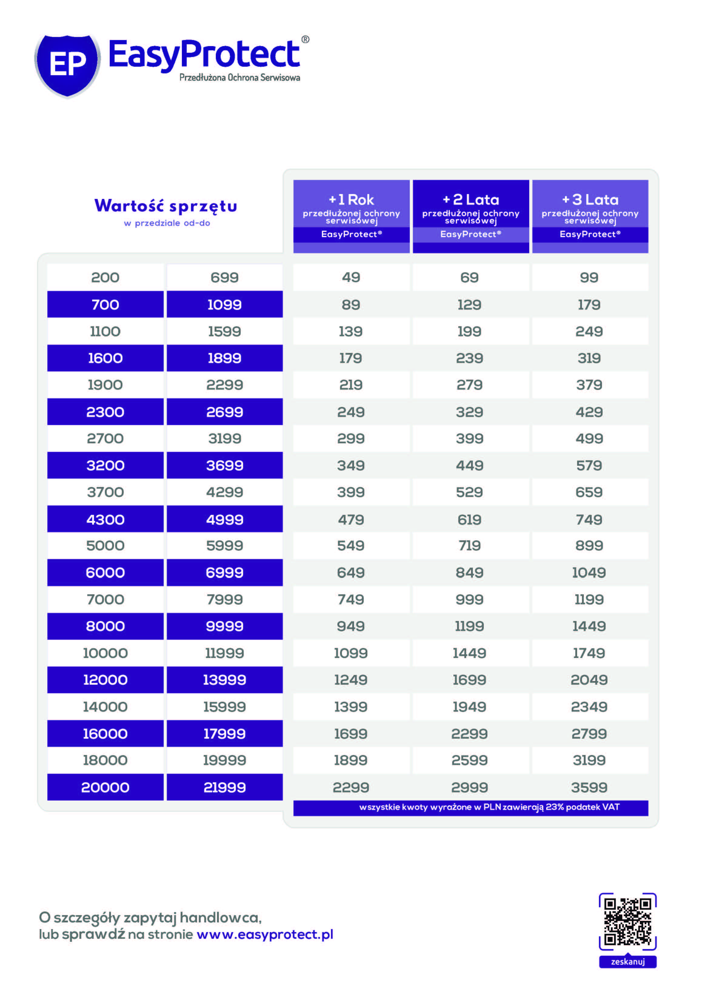 Poniżej koszty ubezpieczenia w zależności od ceny towaru i długości ubezpieczenia.